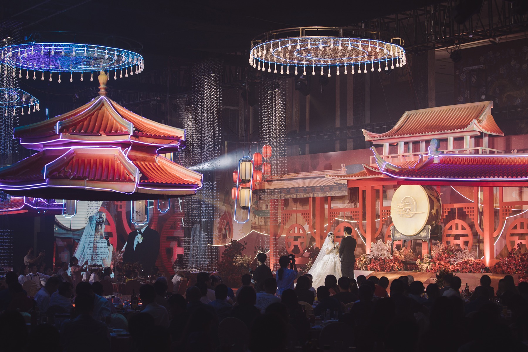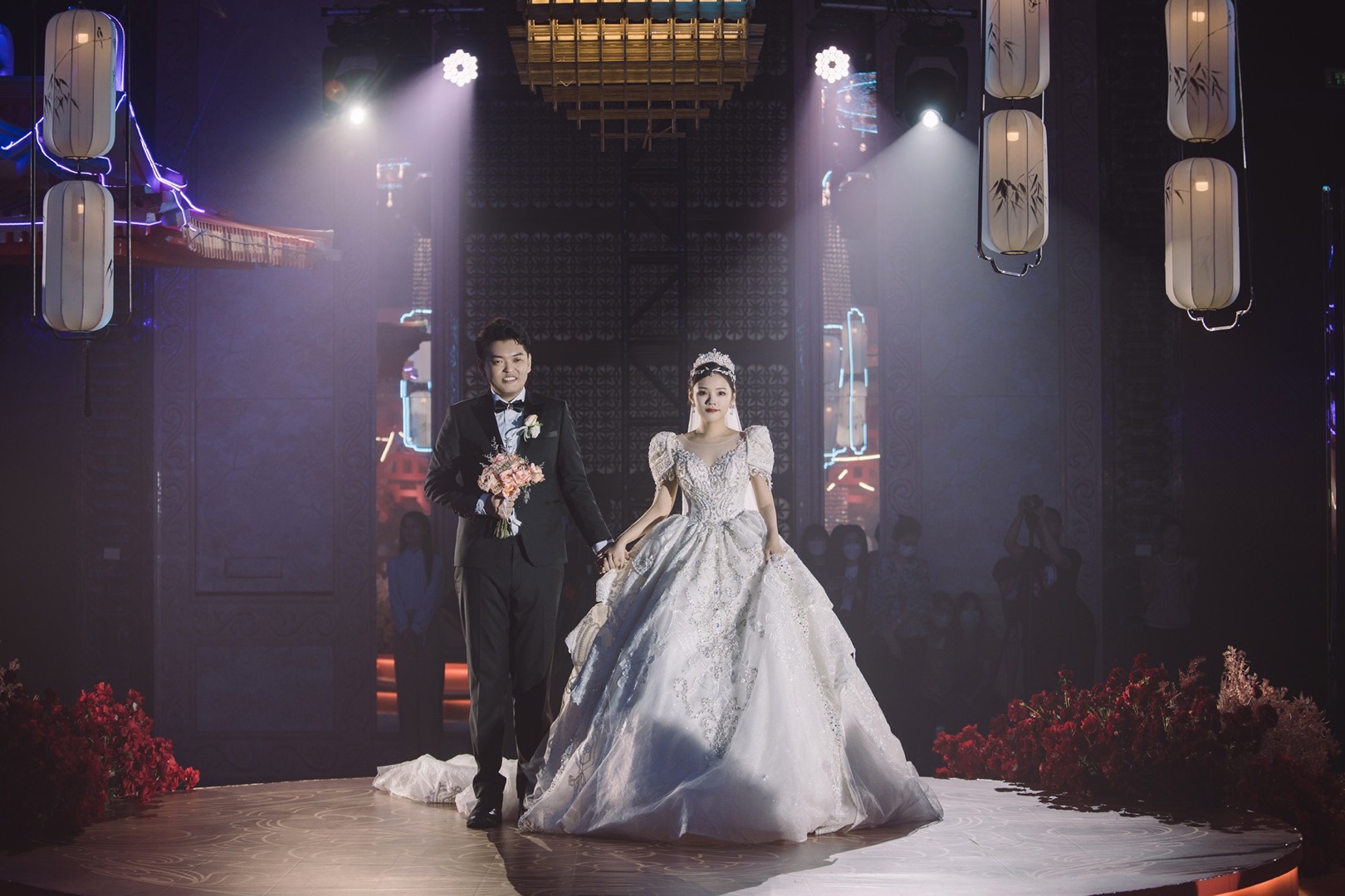 因爱结缘,白头相守。在婚礼现场的亲朋好友们和《MetaLove元囍》线上宾客们的美好祝福声中,新人共同携手步入婚姻的殿堂。此次婚礼现场除常规的幸福满溢的现场实况外,尤为特殊的是融合了国内首个虚实融合的婚礼产品,从参与方式到活动内容都别具一格,婚礼当天的时尚感和氛围感直接拉满!