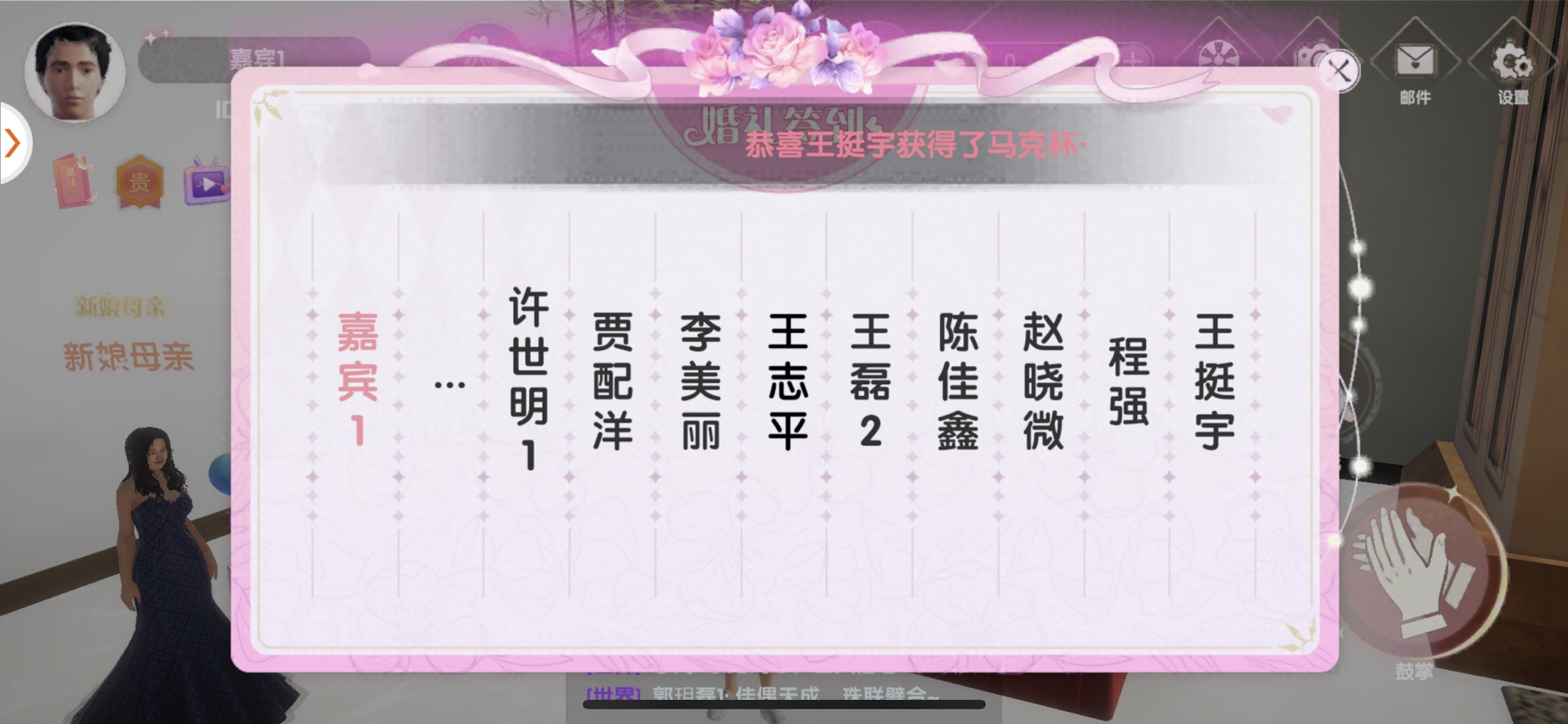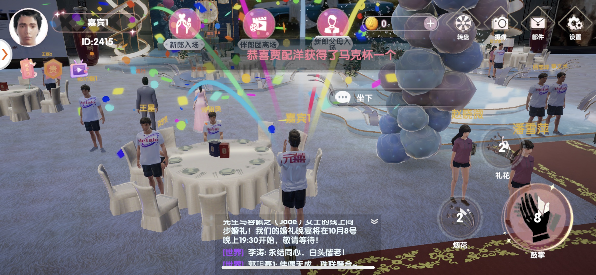 《MetaLove元囍》从“人文传承+传统婚礼+科技技术”角度出发,围绕人机交互、人人交互打造虚实结合社交互动系统,旨在提升用户的参与感和体验感。一方面,虚拟空间中的人物具备行为动作、功能动作、交互动作,可通过“鼓掌、放烟花、放礼花”等方式,为新人捧场;另一方面,虚拟形象成为个人在线上进行表达的重要窗口,用户通过聊天频道进行文字沟通,从而实现陌生人社交的功能,快速建立与他人的联系。